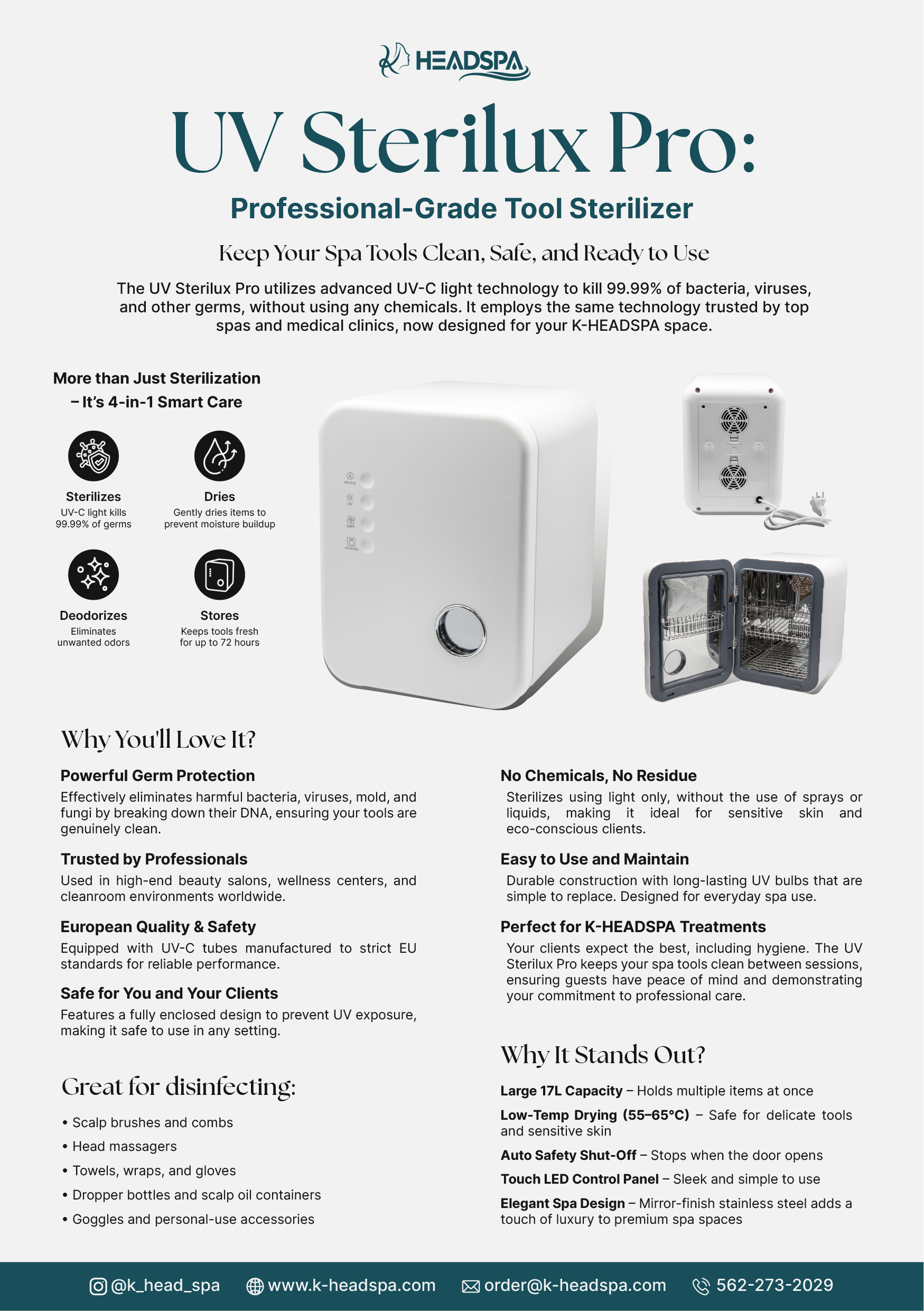 The UV Sterilux Pro utilizes advanced UV-C light technology to effectively eliminate 99.99% of bacteria, viruses, and other germs—without the use of any chemicals. This same trusted technology, which is used in top spas and medical clinics, is now designed for your K-HEADSPA environment.